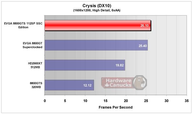 這個測試相當有問題, THG的測試, 是8800GTX vs 8800GT, 28.0 vs 25.3 都是1600x1200 High Quality, 0xAA, 0xAF 他的8800GT完全沒超頻, 實際數字不是問題, 問題在差距10% 今天把8800GTX 閹掉一個Octad, 記憶體減到320bit, 不可能完全沒有影響 這個測試結果就像8800GTX vs 8800GT oc 另外crysis中, ROP較大也對GT較不利, 所以實際上575 112sp的8800GTS應該也是打平8800GT而已 |