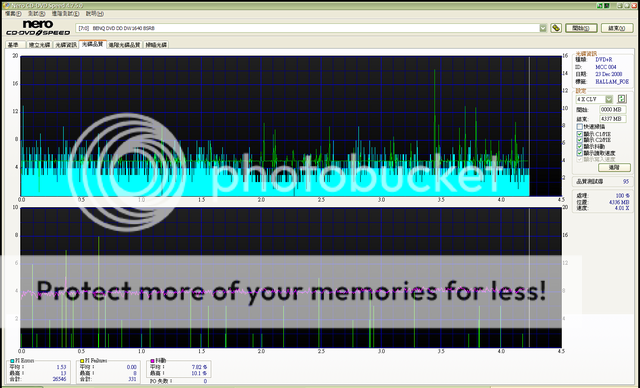 軟體:ImgBurn 片子全都用8X燒,然後我是買散的,所以片子狀況可能不是很好。 HP 片子的圖(同樣的版面,但我買的是16x4.7G): http://0rz.tw/535d2 光碟資訊: http://0rz.tw/3b5fG TEST_1 : http://0rz.tw/6d5ig TEST_2 : http://0rz.tw/0f5fv 全部的圖: http://0rz.tw/d45fo |