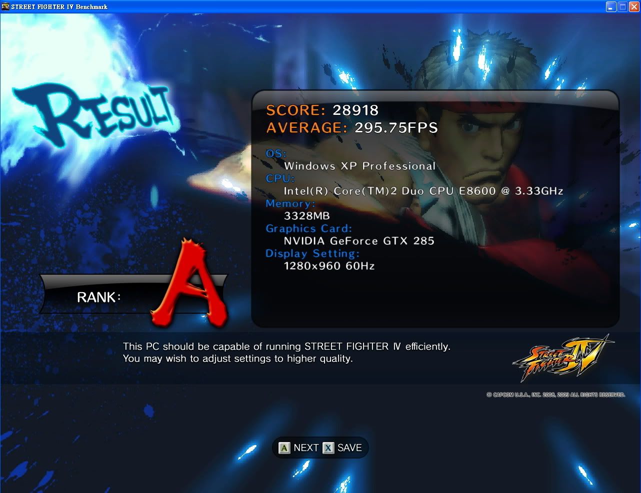 AVERAGE: 72.95FPS OS: Windows XP Professional CPU: Intel(R) Core(TM)2 Quad CPU Q9300 @ 2.50GHz Memory: 2046MB Graphics Card: NVIDIA GeForce 9600 GSO [768MB_DDR3] Display Setting: 1024x768 75Hz (c)CAPCOM U.S.A., INC. 2008, 2009 ALL RIGHTS RESERVED. :cool: |