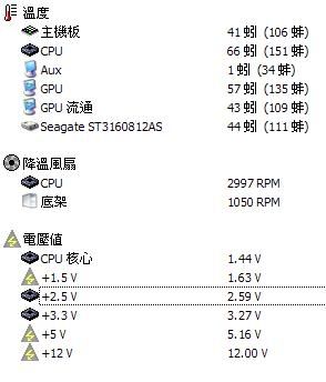 感應器內容 感應器類型 Winbond W83697HF (ISA 290h) 偵測到底架指示 不 溫度 主機板 46 蚓 (115 蚌) CPU 55 蚓 (131 蚌) WDC WD800JB-00JJA0 49 蚓 (120 蚌) Seagate ST340016A 43 蚓 (109 蚌) Seagate ST3160827AS 43 蚓 (109 蚌) 降溫風扇 CPU 3169 RPM 電壓值 CPU 核心 1.58 V Aux 0.05 V +3.3 V 3.26 V +5 V 4.97 V +12 V 11.61 V -12 V -11.95 V +5 V 待命 4.80 V VBAT 電池 3.54 V 會噴火的散步龍2400+XD 該去買散熱膏了=.= |