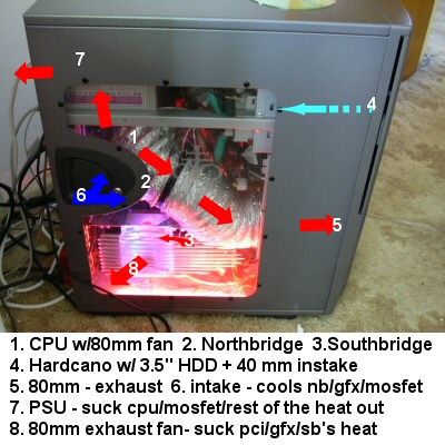 一個直接抽出CPU的熱氣 一個抽出RAM及部分DVD-ROM的熱氣 效果比用後方抽氣的方式較直接 因為熱氣大多聚集在機殼頂端 不過會有風扇的翁翁聲...="= |