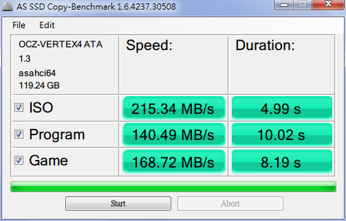 Vertex 4為2.5吋大小,傳輸介面為 SATA 3 介面,在 128GB 的部分,官方公開的傳輸速度為讀取535MB/寫入 200MB 。 Vertex 4 並沒有 128GB 以下的產品,因為 64GB 在安裝完 Windows 7 和 SP1 之後,所剩空間無幾,因此 64GB 已經不敷使用,今年將會以 128GB 為主流產品。 ![]() OCZ Vertex4 128GB SSD 包裝正面,底下有標註高效能設計、MLC Flash、3.5吋轉接架、SATA 3(6Gbps)、支援TRIM及 Indilinxi nfused六個產品特色 。 ![]() 背面有多國語言的標示, OCZ Vertex4 128GB SSD的產地為台灣。 ![]() 配件有多國語言安裝說明、 OCZ Vertex4 128GB SSD、轉接架、嗆聲貼紙和忘記入鏡的螺絲包。 OCZ Vertex4 128GB SSD正面為黑色外觀設計。 ![]() OCZ Vertex4 128GB SSD 背面為金屬髮絲紋。 測試平台 ASRock H61M/U3S3 Intel Core i5 2400 8GB DDR3 ![]() 受限於非原生SATA 3,Crystal DiskMark 3.0.1測試結果讀取為361.6MB/寫入190MB。 ![]() ATTO 8M測試結果為讀取398MB/寫入198MB ![]() AS SSD的測試結果為讀取372MB/寫入184.9MB。分數為704。 ![]() 複製檔案測試結果為4.99秒到10.02秒。 ![]() 解壓縮測試結果為讀取374MB/寫入188MB。 ![]() PC Mark 7測試結果,分數為4933。 ![]() Performance Test 7測試結果為2132分。 同步發表於部落格 |