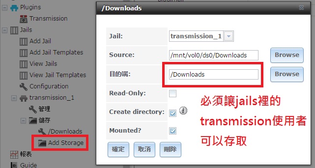 ¡¶ ¦A¦^¨ìJailsªºAdd Storage(¥[¤JÀx¦s´CÅé)¡ASource«ü©w¨ìFressNAS¤¤ªºµ´¹ï¸ô®|¡A¥ØªººÝ«h¬O¦bJails¸ÌªºµêÀÀ¸ô®|¡A¤]¬OtransmissionªA°È¹ê»Ú¬Ý¨ìªº¸ô®|¦ì¸m¡A¦ýsource¥Ø¿ý¥²¶·Åýtransmissionªº¦æµ{¥i¥H¶i¦æ¼g¤J¤~¬O«ÂI¡C