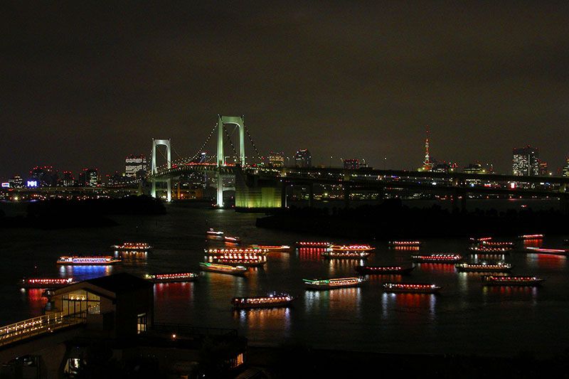 彩虹大橋連接東京汐留與台場,這回是在台場DECKS裡的台場小香港中太陽樓用餐時拍的.上回緯來日本台五花八門大排行自助餐票選太陽樓記得是30名左右,景觀不錯,菜色有待加強.30名大約是彩虹大橋之力吧? 當天台灣客甚多,人聲鼎沸,可說是有景觀無氣氛. |