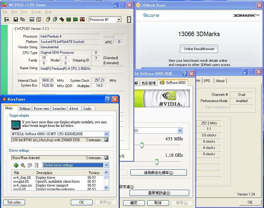 1:v9999ge刷任何6800ultra bios後,均以16管(小弟認為)"記憶體匯流頻寬均35264MB/秒及pixel Fillrate+Texel Fillrate均為6800MB/秒"之效能運作之(圖1,2)...軟改16管與否均相同.