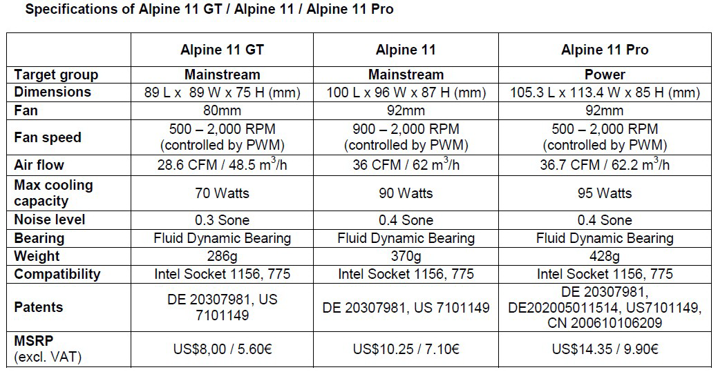 AC 發布了 3 款針對 Intel 次世代新腳位 LGA1156 的 CPU Cooler Alpine 11 [color=PinkAlpine 11 GT[/color] Alpine 11 Pro ![]() 參數規格︰ ![]() 外型預覽︰ ![]() ![]() ![]()