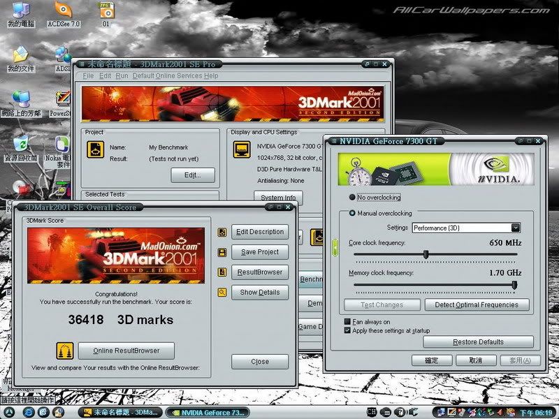 這是今天的主角: MSI7300GT-DDR3 128M ![]() 風扇聲音真的..... 測試配備: E6600 @3.0G 945P-S3 DDRII667 @835 顯示卡沒有MOD 3DMARK皆預設值跑(不做偷吃步的事..) MARK01 ![]() MARK03 ![]() MARK05 ![]() MARK06(還沒灌..... )以上謝謝收看....如果換上好的風扇在加上MOD...我看應該會爆走.... ![]()