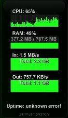 ![]() 最近在桌面放了一些雅虎widget工具 對於這個簡單明瞭的小東西還滿喜歡的 SimpleMonitor 一目暸然系統資源檢視器 除了 cpu 記憶體 下載速度 上傳速度 之外 最底下還有 目前ip 以及 開機多久的資訊 (此圖ip部份被我塗掉) 可是目前的0.5.3版卻怪怪的 不但最底下的時間部份無法顯示 連 下載 上傳的速度顯示都讓我快樂起來 我用的是 8M/512 看一下flashget也沒有跑那麼多啊 真是ooxx ![]() |