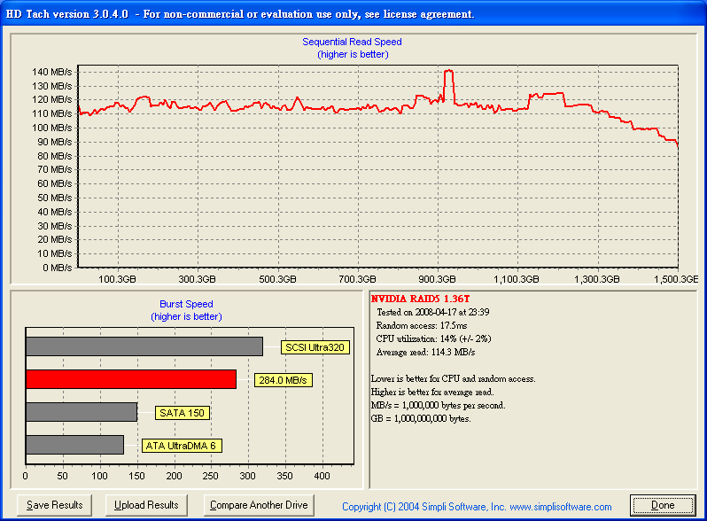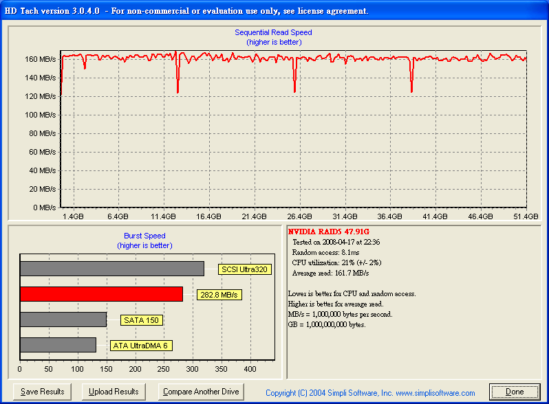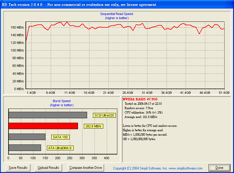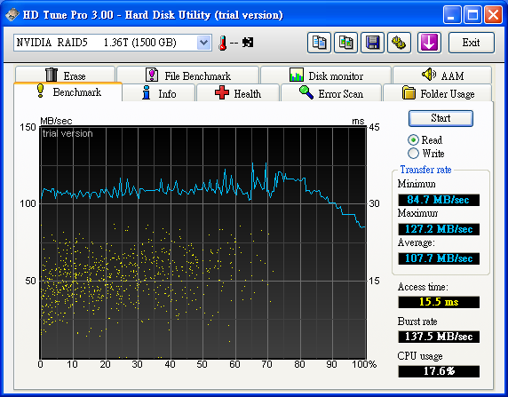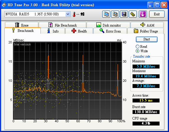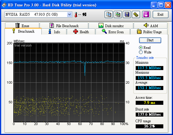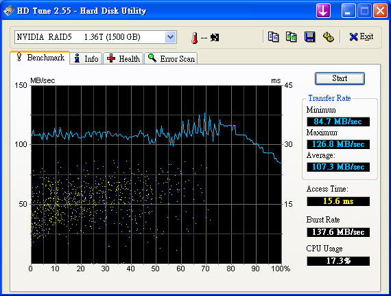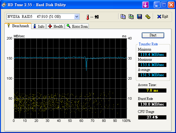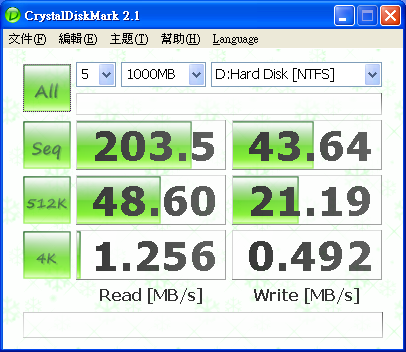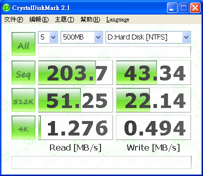 之前 在這說過 http://www.pcdvd.com.tw/showthread....31&page=1&pp=40 有空 會測一下 6150 + MCP 430 的 Raid5 效能 查了一下 google 在 The Southbridge Battle: nforce 6 MCP vs. ICH7 vs. ICH8 http://www.tomshardware.com/2007/01...tle/page17.html Chipset Serial ATA and RAID performance compared - The Tech Report - Page 13 http://techreport.com/articles.x/9124/13 似乎 Intel Raid 5 比較快 =============================================== 測試 環境: Windows XP SP2 青雲 SP2800+ oc 2.4G Socket 754 6150+MCP430 首先 750G x 4, 但是 MCP 430 不支援 2T 以上 所以 2T 又 47G 變成 47G ![]() HD Tach Quick Test @ MCP430 Raid 5 4 Disk ![]() HD Tach Long Test @ MCP430 Raid 5 4 Disk ![]() HD Tune 2.55 Read Test @ MCP430 Raid 5 4 Disk ![]() HD Tune 3.00 Read Test @ MCP430 Raid 5 4 Disk ![]() HD Tune 3.00 Write Test @ MCP430 Raid 5 4 Disk ![]() Crystalmark 2004 500MB @ MCP430 Raid 5 4 Disk ![]() Crystalmark 2004 1000MB @ MCP430 Raid 5 4 Disk ![]() FDBENCH @ MCP430 Raid 5 4 Disk ![]() 基本上 Read 的時候 , CPU 使用率 20% Write 的時候 , CPU 使用率 7% 很奇怪 ?! |