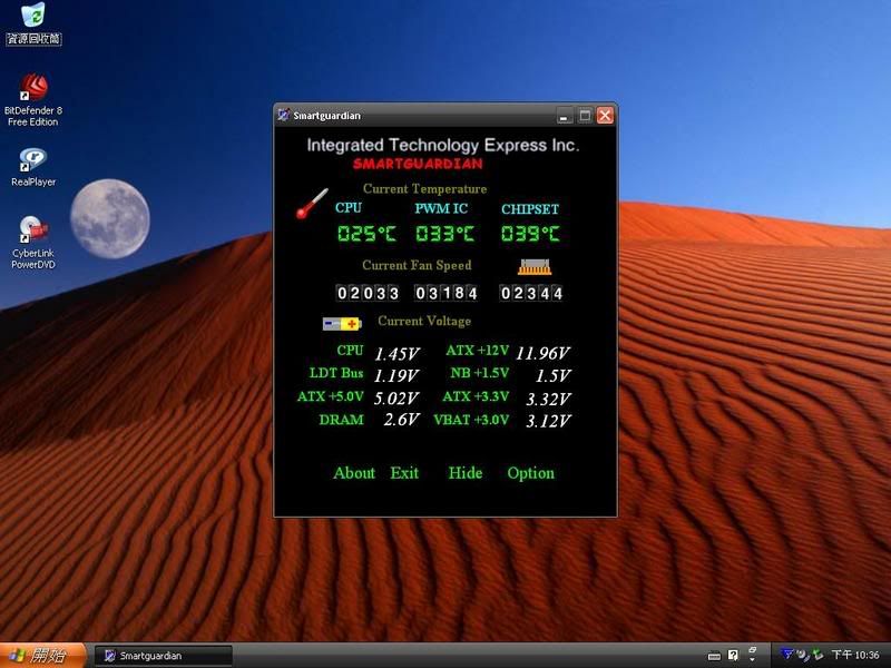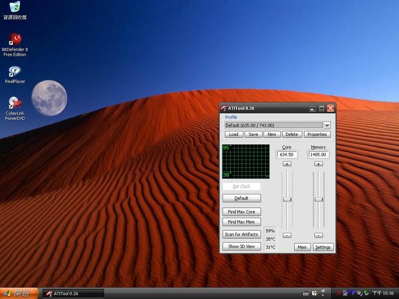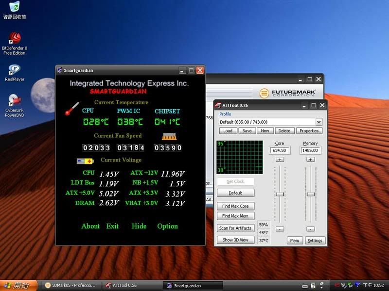原裝鋁製DFI散熱風扇 未使用Spot Cool前.系統閒置-風扇在5500-6000轉左右游走.負載-7300轉. 所放置的地方......風向的位置 ![]() 主機閒置....只看NF4-SLI温度和轉速 ![]() X1950pro RV570温度-閒置 ![]() 跑了3D MARK 05 1024X768 4XAA 10分鐘後.立即開來看 ![]() ---------------------------------------------- 謝謝收看.