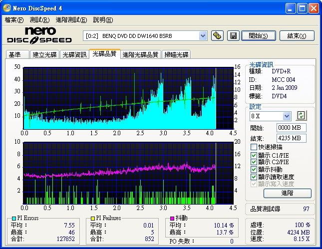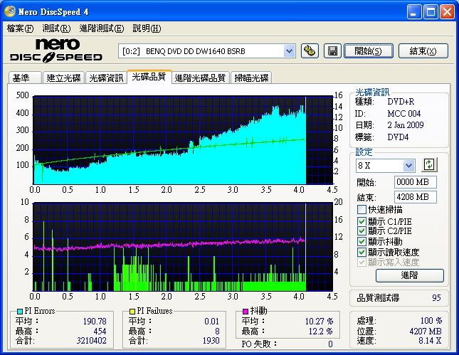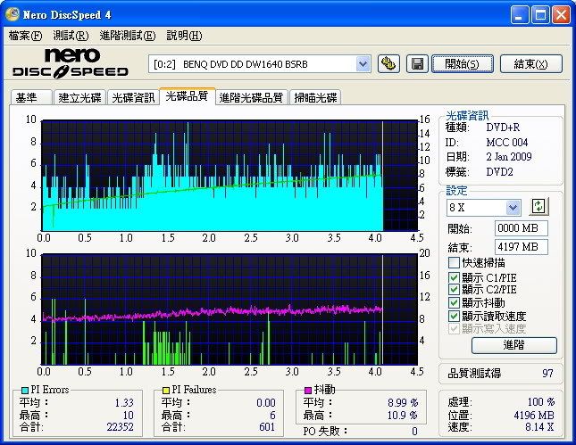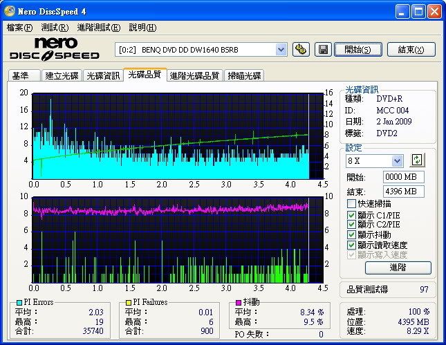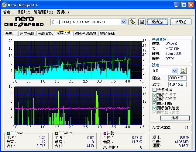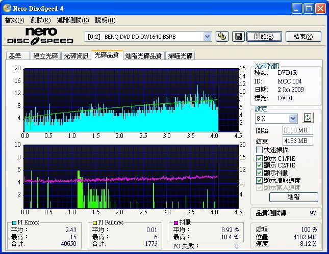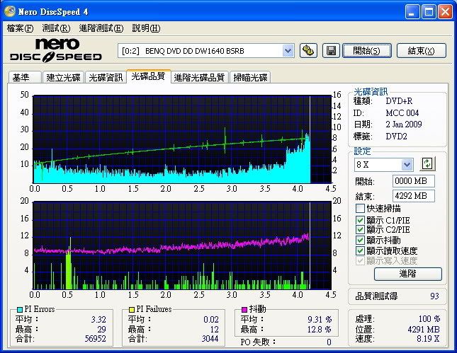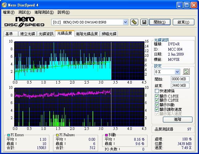 用偽1640測 99分 沒燒滿 不好意思~因為該影片轉出來不到3G 這款剛從大潤發買回來的 20片 $99元...... 建議要挑的網友還是找 9886的吧.. 9987燒出來的確是跟樓主一樣的成績... |
