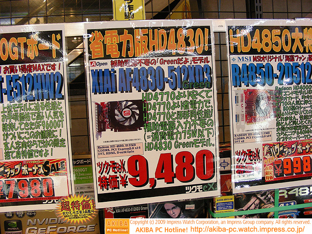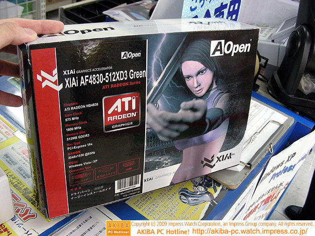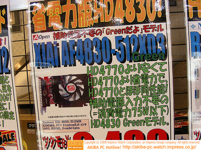 繼先前 ColaMax 香港 Radeon HD4830 短卡版免吃電發售後 ![]() ![]() Aopen 顯示卡品牌 XIAi 也發售了一張 幾乎相同的「XIAi AF4830-512XD3 Green」 日本市場零售價為 9,480 日幣 目前已經登陸日本零售市場販售 主要特徵為 6Pin EPS 省略消費電力「75W以下」 ![]() ![]() ![]() ![]() ![]() ![]()