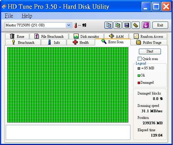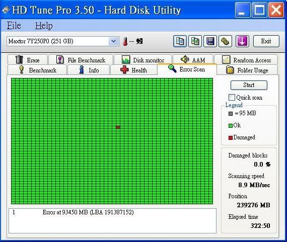 ![]() HdTune掃瞄硬碟,不管幾G,這個綠色表格好像都一樣多格,所以一個紅色,250G的硬碟,一格代表196089sector,豈不是至少有好多sector是壞軌? |