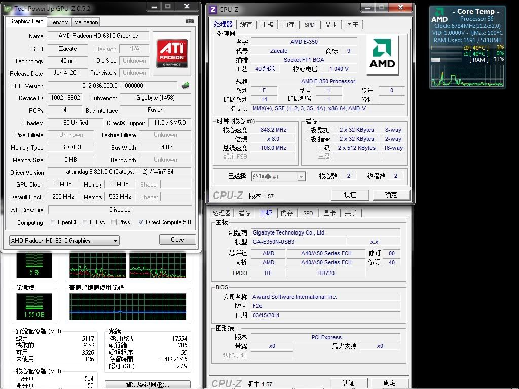 也展示了很多家的板廠的成品 只是至今在店面看的到的產品少之又少 本來看上的是ASUS的其中一塊 但是目前只買的到技嘉的這一塊(GA-E350N-USB3) 等了一陣子不想等了就只好入手這一張小板 以前最小只玩過micro-atx的板子 mini-itx的板子感覺更精簡 還好usb還算夠多 小弟因為同時還有一台下載用的ATOM(230)的系統在使用 APU的效能明顯感覺順暢許多 更不要說ATOM那台i945G的鳥內建顯示了 APU目前我覺得最大的優點是播放影片的能力 目前測試過用MPC-HC不管是xvid還是 H.264(包括BD影片檔)都很順暢的播放 (不過試過用軟解BD影片基本上就是幻燈片了) 溫度也算控制得不錯 目前就等找到一個合適的機殼 就準備搬到客廳裡了 有興趣的可以看看~~~ 很小的外盒包裝 ![]() ![]() ![]() 規格 ![]() 超精簡的內容物 ![]() 本尊 ![]() ![]() ![]() 背板IO ![]() 散熱器 ![]() ![]() ![]() 不知道共幾相的電源 ![]() 上機 ![]() ![]() 進OS(小超6MHz,不太能超) ![]() xvid(軟解) ![]() h.264影片(啟動DXVA) ![]() BD影片一(啟動DXVA) ![]() BD影片二(啟動DXVA) ![]() |