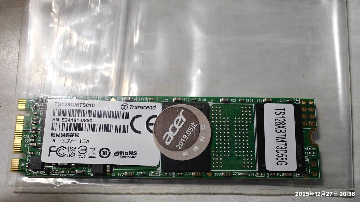 2.數量 : 1片 3.規格: TS128GMTS810 4.品相及保固 : 已過保固 5.售價 : 新台幣500元 6.地點 : 7-11賣貨便或是新北板橋區 在板橋新海橋附近指定地點面交 算400元 7.交易方式 : 面交&現金交易&賣貨便7-11(須負擔運費) 8.有意購買者:站內信,或文章底下回應 9.販售原因: 以前acer筆電的贈品,但是我沒有其他M.2 SATA的設備可以用,所以未使用,一直放在氣泡袋裡面。 10.瑕疵提醒: 無,沒使用過,現在也沒有設備測試。 |