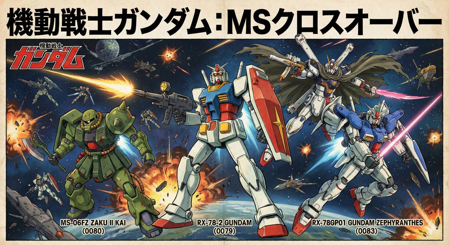 請幫我生一張 1.0079阿姆羅 2.0080巴尼 3.0083浦木宏 4.機動戰士海盜高達初登場托比亞 一起出現的海報 |