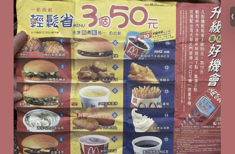 當年的麥當勞有30元漢堡,後來還有出任選3個50元活動,然後麥香魚麥香雞比現在貴