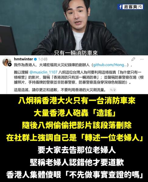 笑死,八炯繼抹黑鍾明軒裝死不道歉後,再度造謠香港大火「只有一台消防車來」,目前被大量香港人炎上要求道歉 這麼大型的翻車事件,正常網紅一定是先拍影片公開鞠躬道歉,結果大家猜猜八炯是怎麼處理的? 1.八炯偷偷把自己造謠的原影片最後一段進行剪輯,略懂剪輯的人應該都可以看出來,而原影片提到「過了兩三個小時,只有一台消防車來」,這在YT一些新聞媒體都有原段落,結果現在八炯影片這段已經消失了。 這就是深厚的「大街造謠,小巷裝傻」功力,只有紙紮人有這樣的本事,假裝沒事就不用道歉。 2.率先開砲的是「香港火災紀錄庫的創辦人」鄭女士,她強調「消防車很快就到了」要求八炯造謠快道歉更正。 結果:八炯貼出一個老婦人的說法,強調自己是轉述者,要大家去告老婦人。 3.八炯在原片從頭到尾沒有講清楚自己的資訊來源只是一位老婦人。 4.香港網友紛紛開砲「對方只是情緒上的災民」、「既然你在網上發佈資訊,是有責任去fact check(事實查核)的」。 八炯怒回「要老婦人認錯,我會道歉」。 5.一位香港網友表示「不經查證直接當事實轉述還能理直氣壯,台灣真不愧是假資訊大國,詐騙集團新手村」 八炯成功讓世界看見台灣散播假資訊的能力有多強大! 任何一個人,在社群上對於嚴重災情的事件,所有訊息都應該經過多方查證後,再去傳遞資訊。 我看到不少香港網友本來就是會收看他節目的觀眾,結果對於他造謠不道歉的行徑很傻眼。 讓香港人們見笑了,很多時候我們台灣人,對於這樣的事情也是很無能為力,說假話比說真話的資訊更多人相信。 如果香港人有不舒服的地方,只能說句不好意思,台灣的某些人給你們造成困擾了。 希望香港人無論是災後重建、心理上都能撫平傷痛,辛苦了。 ![]() 我覺得不分軒輊 ![]() |