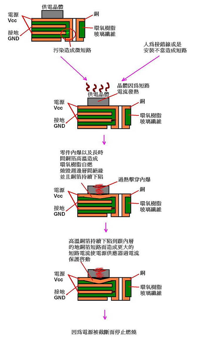 ![]() 看起來是供電Mos-FET過熱造成晶體包裝無法承受, 擊穿之後往下燒穿電路板表層玻璃纖維, 之後電路板內層的GND還有Mos-FET的Vcc持續延燒到電源供應器的過電流保護啟動, 或是人工截斷110v電源為止。 如果非人為接線錯誤或是主機板安裝短路, 此類情形多屬於主機板的電路載板在製造過程當中製程不良, 造成電路板層間線路連接用貫孔和貫孔周圍銅面因為電路板製作過程當中, 清洗不全的藥水結晶遷移而形成電源與接地之間的微短路。 當微短路已形成,其發作屬於間歇性, 亦即-->結晶-->微短路-->高溫-->結晶破壞-->微短路-->高溫-->結晶破壞 如此重複直到周圍材料均已碳化並且藥水已經因為高溫揮發不足以形成結晶方才停止。 通常此現象多發生在段路板上電壓最高與最低電位之間, 因為電位差大會造成結晶生成速率提高。 且只有電源端方有夠大的電流足以加熱到燃燒地步。 運氣好者即電源失效。 運氣壞者則因為長時間高溫超過環氧樹脂承受溫度, 使電路板層間粘合用的環氧樹脂碳化自燃, 自燃之後電路板層間絕緣破壞造成電源對地直接短路即會形成樓主這樣的現象。 從受害面積不大判斷電源供應器過電流保護有及時動作, 或是使用者聞到異味之後有及時切斷電源。 縱歸,此例的情形其發生順序如下。 ![]()