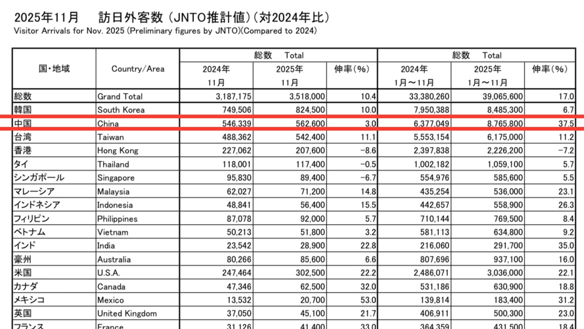 ¤¤¦@³Û¡u¤Åu¤é¡v¨S®Ä¡H¤é¥»Æ[¥ú§½Åγ̷s¼Æ¾Ú¥´Áy¡G¤¤°ê¤H¤ñ¥h¦~¦P´Á¦h ¤é¥»Æ[¥ú§½¤]ÅÎ¥X2025¦~11¤ë³X¤é¥~°ê®È«È¤H¼Æ¡A ²Ä¤@¦W¥ÑÁú°ê¹Ü¤U¡A¨Ó¨ì824,500¤H¦¸¡A¬Û¸û¥h¦~¦P´Á¼Wªø10%¡A ²Ä¤G¦W«h¬°¤¤°ê562,600¤H¦¸¡A¤ñ¥h¦~¼W¥[3%¡A ²Ä¤T¦W¬°¥xÆW542,400¤H¦¸¡A¸ò¥h¦~¬Û¤ñ¼W¥[11.1%¡A ȱoª`·Nªº¬O¡A¬ü°ê11¤ë³X¤é¹F¨ì302,500¤H¦¸¡A»P¥h¦~¦P´Á¤ñ¤j¼W22.2%¡C
