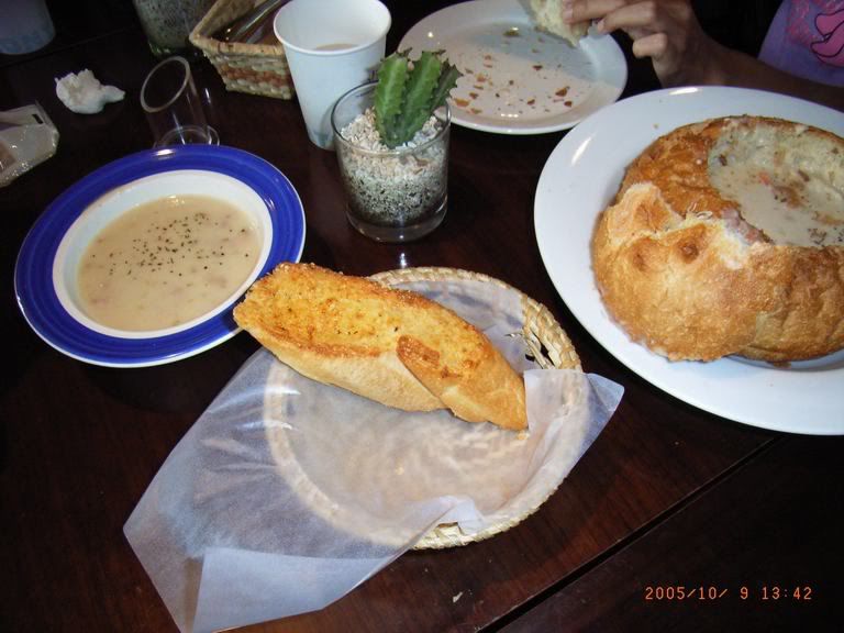 ![]() 這是在水灣餐廳所吃的午餐, 蒜頭麵包吃起來很酥脆,至於焗烤麵包(記錯起勿怪)則是慢慢地撕開,邊吃邊沾焗湯.. 吃起來很可口 一旁的是應該算是玉米濃湯的一種(沒喝到那一盤)
