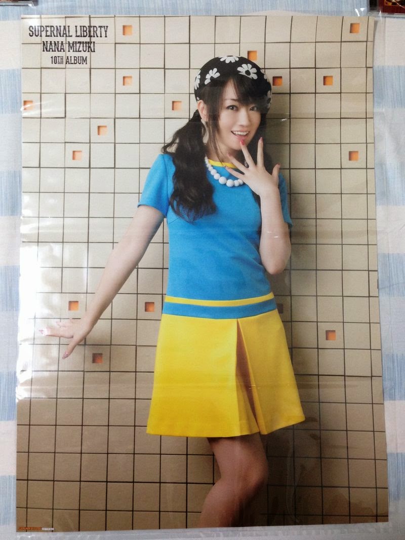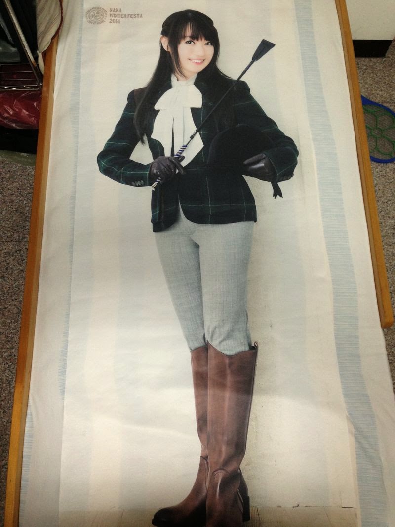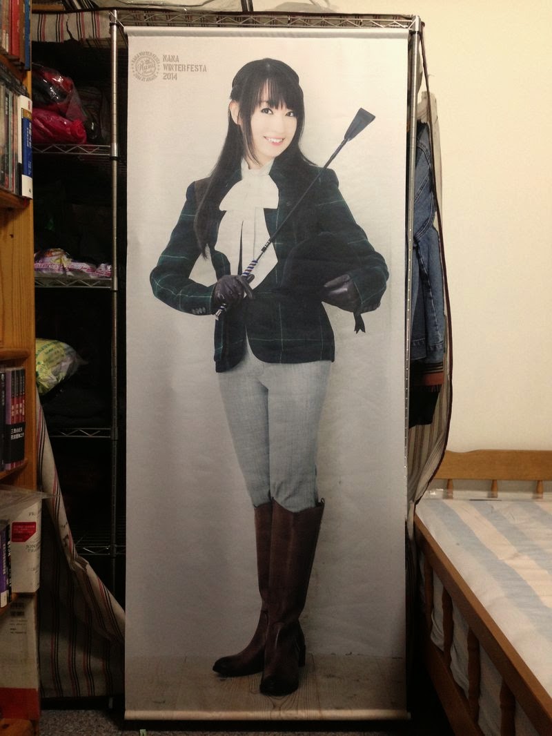 掛軸先到! 想說等身大應該還好,以奈々的身高,應該不會很長,一展開根本就跟我一樣高了,攤開放床上,長度剛剛好,見鬼! 掛到衣櫃上實際丈量,減頭減尾,感覺好像還是比印象中(去年11.24的近距離目擊)高了一點?懷疑在印刷時有偷偷加長了10公分...