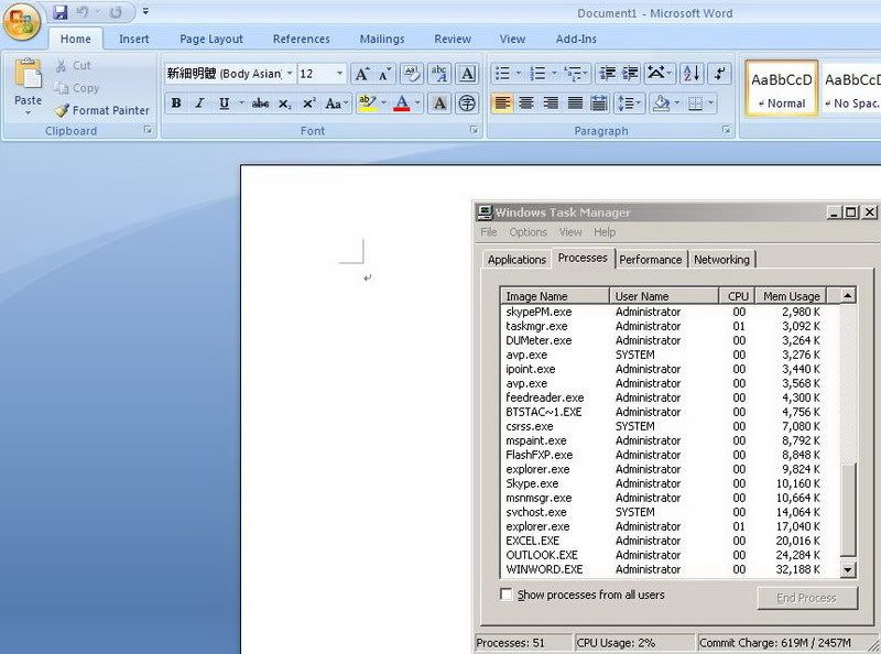 剛開word, 17~19mb. 開始打字過第二行, 24mb. 之後的慢慢開始增加, 但沒有跳躍式的記憶體使用幅度. --------------------------------------------- 真正使用: 至少'有音樂在播放, 有時候看影片.(CPU) 跑軟體轉檔, 有時候是DVD, 有時候是CD.(CPU&ram) 的同時, 我還在做文書(至少會有word, excel.)(ram) 伴隨著至少9個IE在遊覽網路, 其中大部分是資料(少部份是娛樂, 譬如PCDVD固定開2頁)(ram) 所以不要說ram, 其實硬碟只有一顆也是問題所在, 會頓難免.(page&storage) CPU跑80~90%也是常態. 用的最少的, 反而是顯示卡(MX440) 咳咳, 但是一打魔獸, 顯卡就破功了(所以遊戲畫面我只能暫時不強求). 所以, 我要存錢換新電腦. 用過雙核的筆電後, 感覺OS根本不是重點, 使用習慣才是. OS喔, 用熟最重要. |